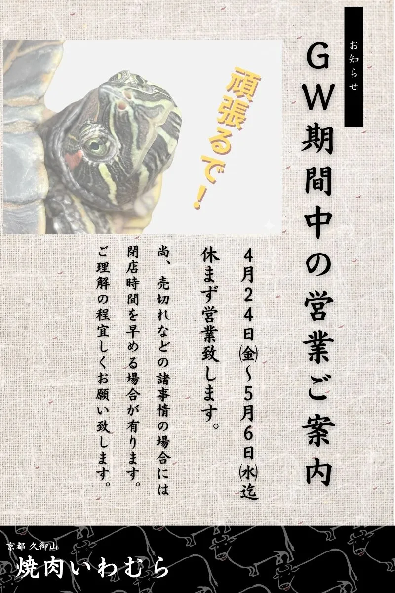 2026年GW期間中の営業ご案内 2026 4/07 おしらせ一覧 2026-04-07 おしらせ一覧 URLをコピーしました! URLをコピーしました! 久御山生活応援ギフト使えます! 関連記事 久御山生活応援ギフト使えます! 2026-03-09 3月臨時休業のお知らせ 2026-01-19 9月休業日のお知らせ 2025-07-18 メニュー増えました。 2024-04-22 店内を改装しました。 2024-04-13 ネットでのお席のご予約について 2024-01-16 大切なお知らせ【1/11更新】 2023-12-02 当店には無料Wi-Fiを設置しております。 2023-03-02